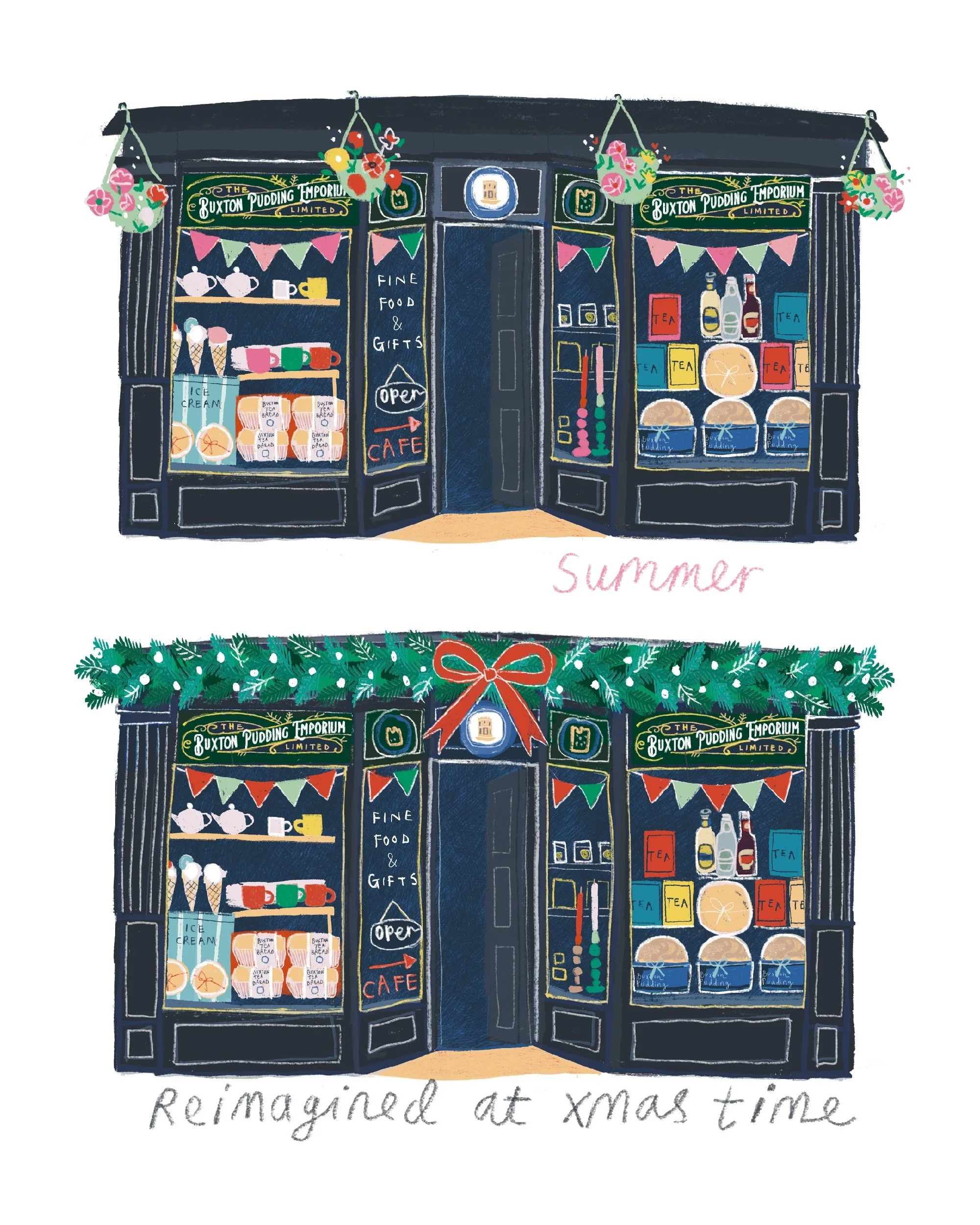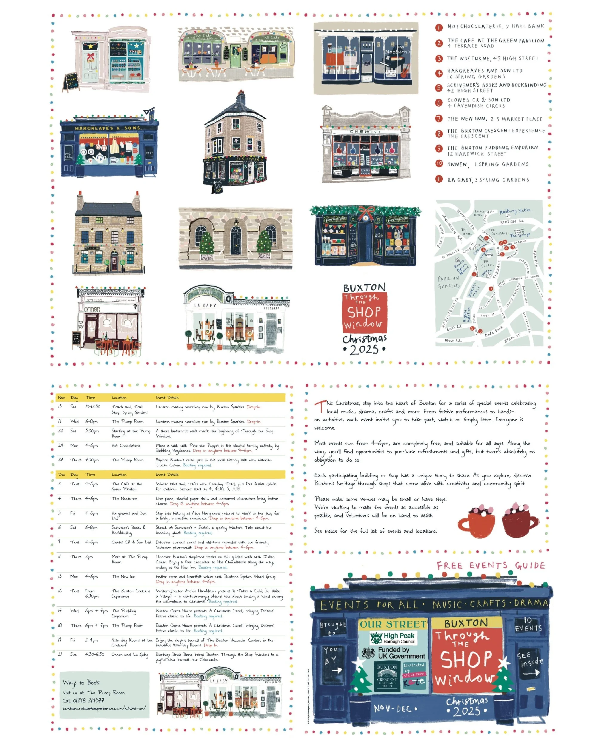 Through The Shop Window An absolute joy to work on, this is a series of illustrations for an events guide and posters commissioned by Buxton Crescent Heritage Trust and Buxton Our Street for Buxton Through the Shop Window 2025. Next Back